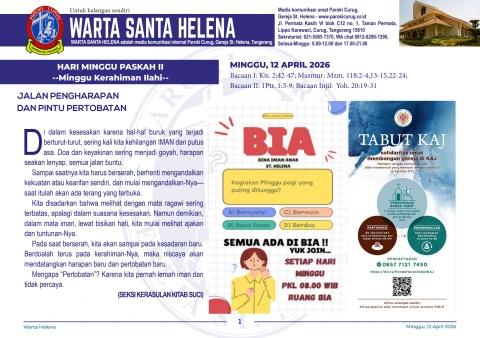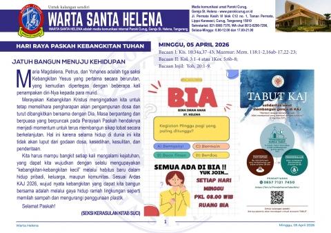 Warta Santa Helena adalah media informasi internal Paroki Curug – Gereja Santa Helena, terbit mingguan setiap hari Minggu.